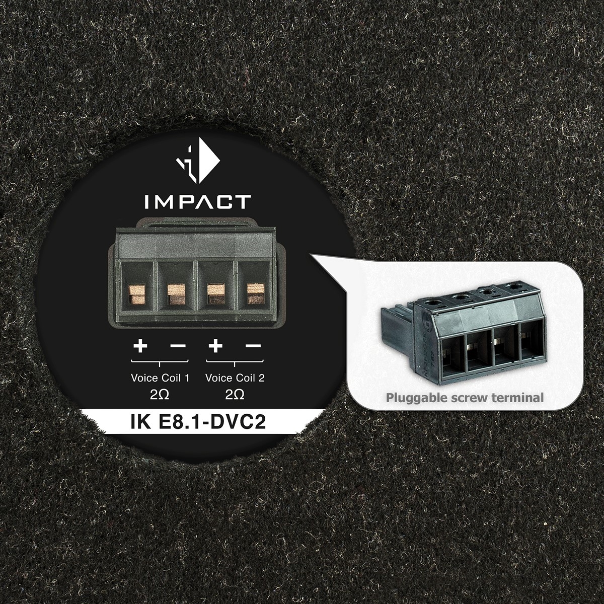 IK E8.1-DVC2 har føder med velcro som forhindrer, at subwooferen glider rundt i bagagerummet og den har stikbar skrueterminal, så du kan frakoble subwooferen fra forstærkeren nemt og kan dermed hurtigt tage den ud af bagagerummet, når du får brug for mere plads.
