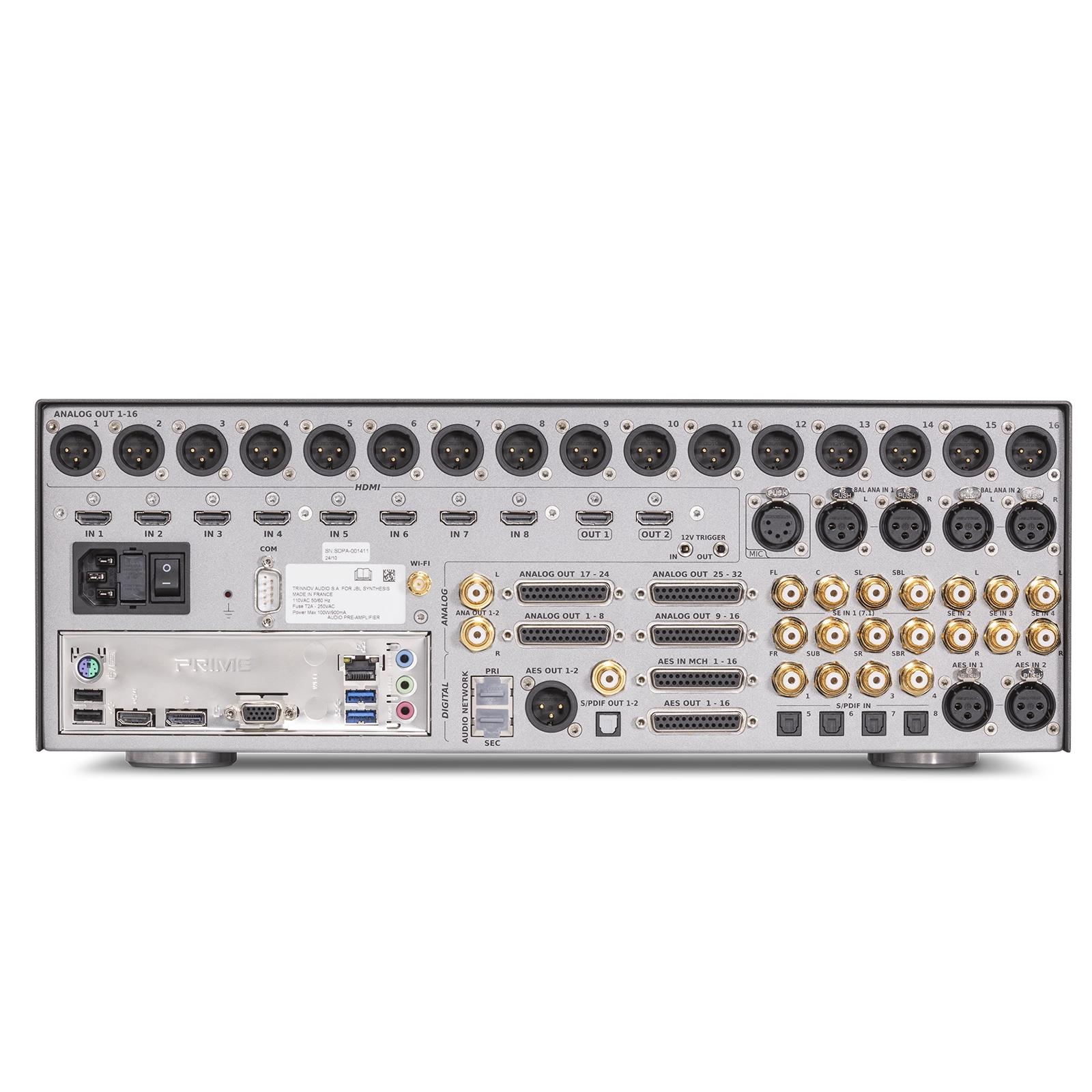 16 x XLR multichannel, 4 x Balanced DB25 (channels 1-32), 1 x RCA stereo