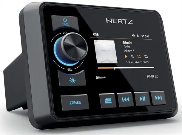 Hertz Marine HMR 20 er en marine radio der er lavet til at blive monteret i en båd og kan modstå alt slags vejr der findes i det åbne havmiljø. Den har en flot 3" farveskærm hvor man kan se hvilken radio station der bliver afspillet, hvilken sang der bliver afspillet via Bluetooth og USB. Den har også en spændingsindikator til kontrol af batteristatus som bliver vist på skærmen.