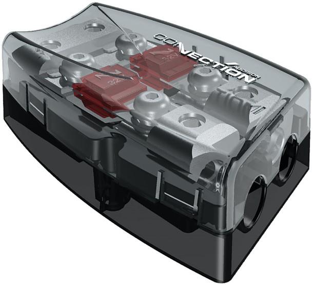 Den har plads til to Mini ANL sikringer på mellem 15-300 amp. (medfølger ikke) Man bruger typisk en sikring til at sikre en strømkabel mellem batteri og forstærker, så strømkablet ikke går i brand og forstærkeren ikke kortslutter.