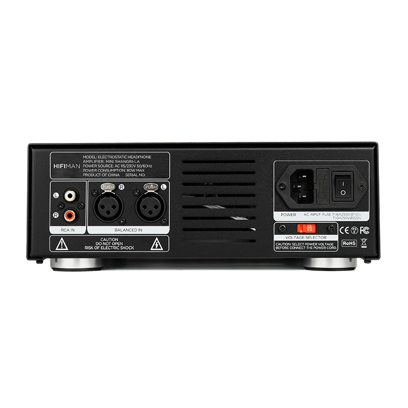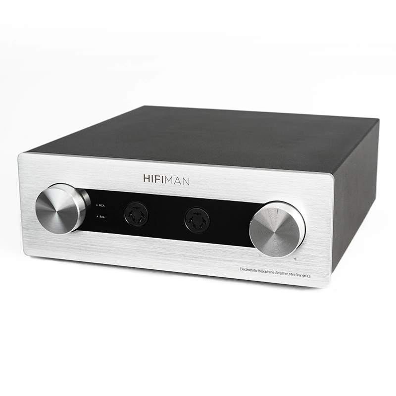 Mini Shangri-La er et ægte system, hvor høretelefon og forstærker er udviklet som en samlet løsning. Den medfølgende elektrostat-forstærker, leverer den nødvendige højspænding (typisk 550–650V bias) for at drive membranen med absolut præcision.