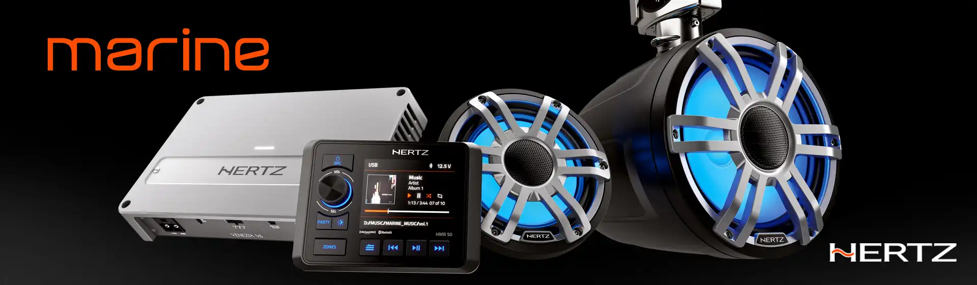 Hertz Marine«s højtydende headunits, højttalere og forstærkere er designet til at fungere i havmiljøet. Og til at begejstrede dig med de følelser som musikken giver alt imens du nyder at sejle!